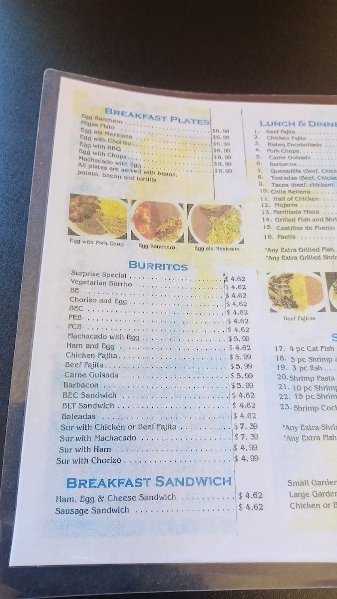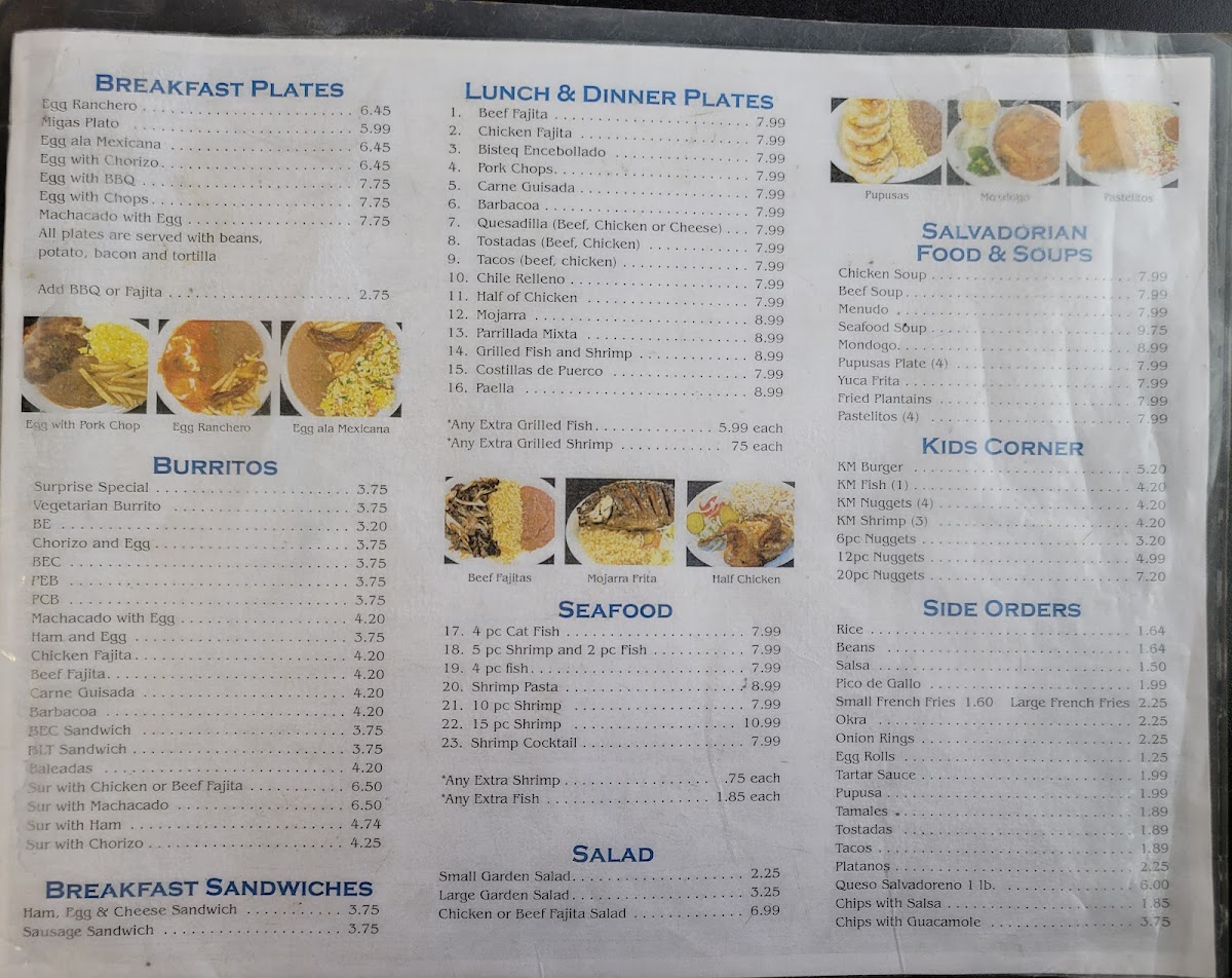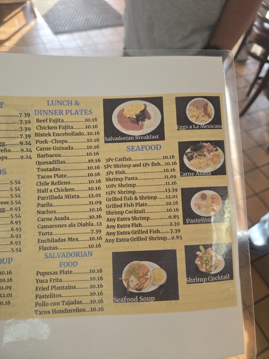 The menu features classic breakfast plates like eggs served with pork chops or chorizo, alongside generous burritos filled with chicken fajita or barbacoa. For midday or evening, there are satisfying options such as pupusas, crispy fried shrimp, and tacos de asada, reflecting both traditional and casual dining styles. Seafood lovers can enjoy the mojarra frita or a shrimp Po’ Boy, perfect for those seeking a laid-back meal with fresh flavors.