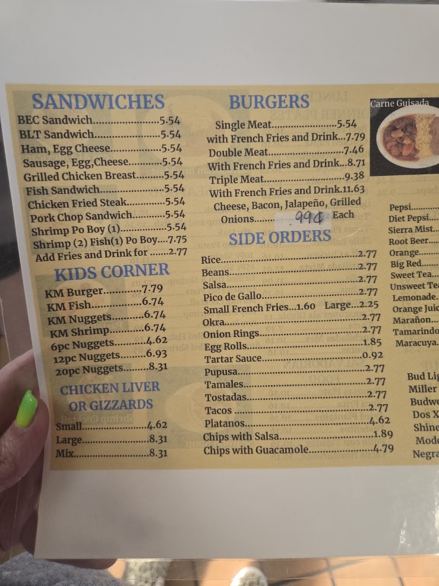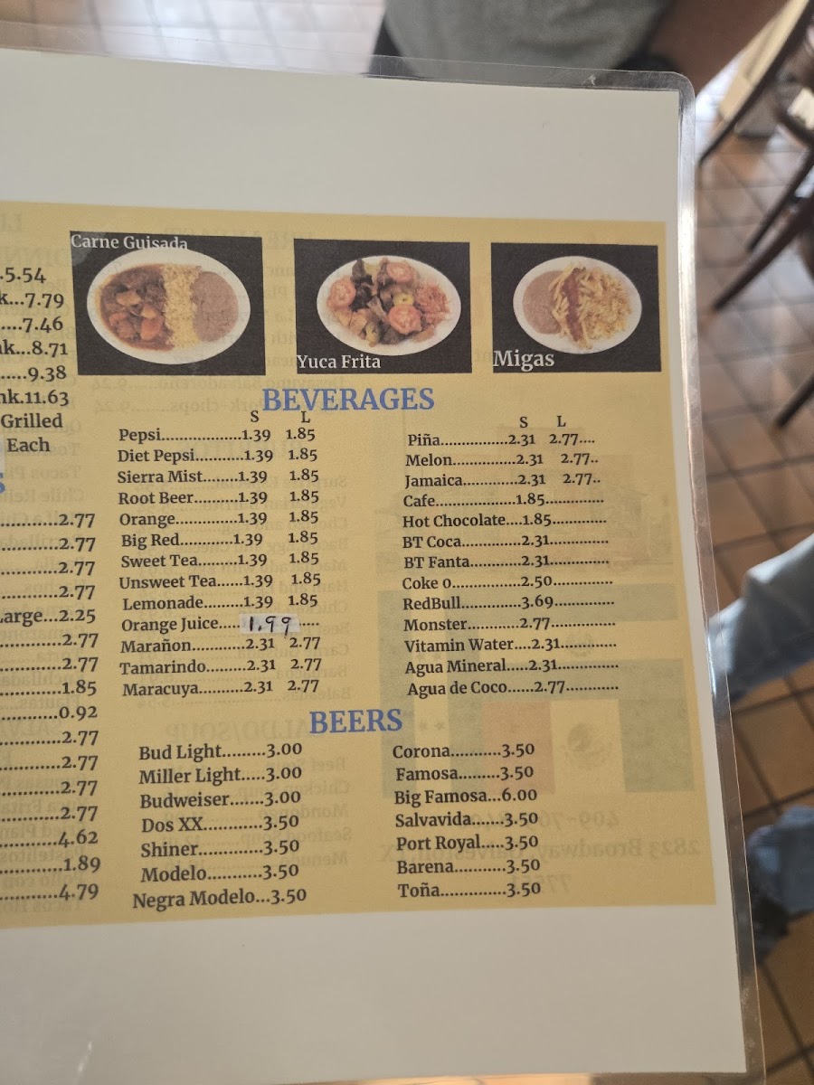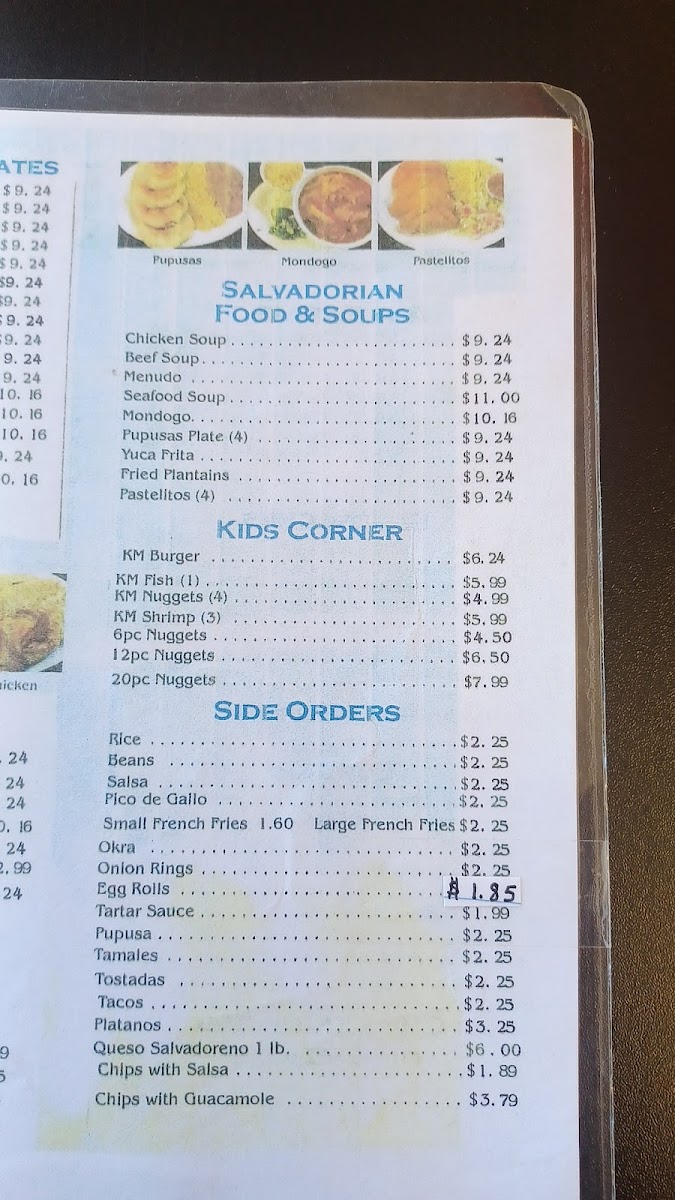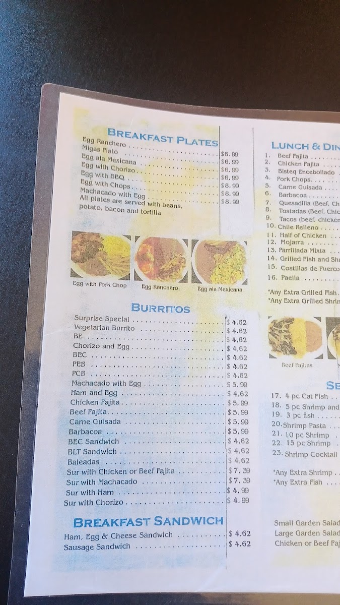 The menu features classic breakfast plates like eggs served with pork chops or chorizo, alongside generous burritos filled with chicken fajita or barbacoa. For midday or evening, there are satisfying options such as pupusas, crispy fried shrimp, and tacos de asada, reflecting both traditional and casual dining styles. Seafood lovers can enjoy the mojarra frita or a shrimp Po’ Boy, perfect for those seeking a laid-back meal with fresh flavors.