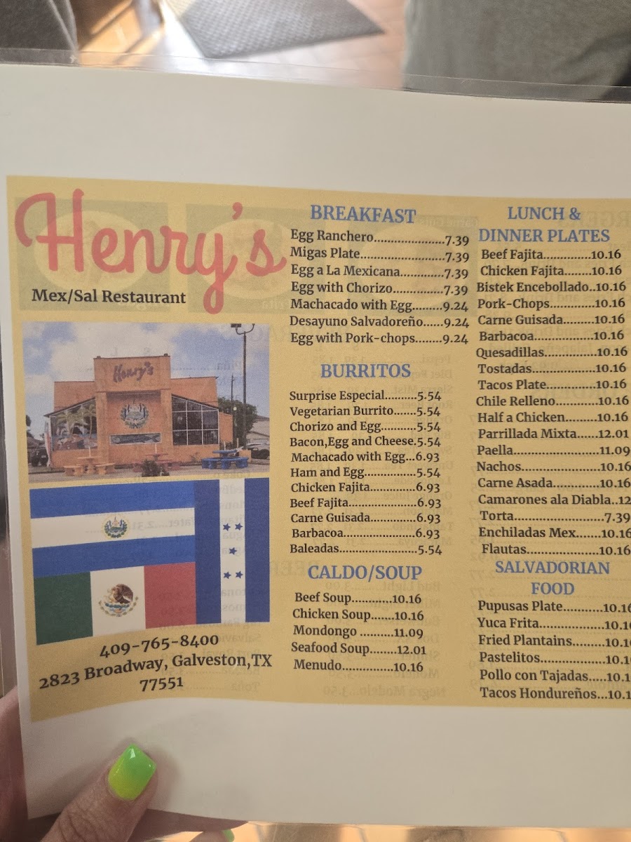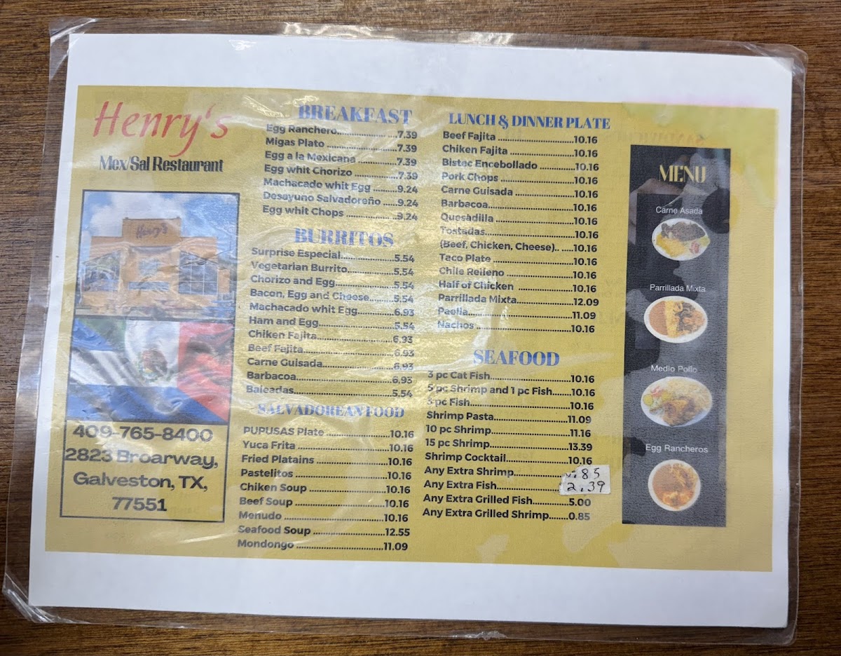 The atmosphere at Henry’s pairs well with these offerings—simple, welcoming, and unpretentious, making it an easy spot to relax and enjoy generous portions. Drinks and desserts complement the savory choices, with paletas and flan rounding out the experience. Overall, the menu feels approachable and balanced, meeting the needs of locals and visitors looking for down-to-earth Mexican and Salvadoran fare any time of the day.